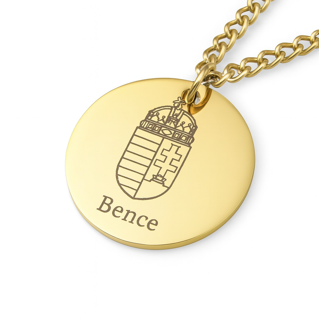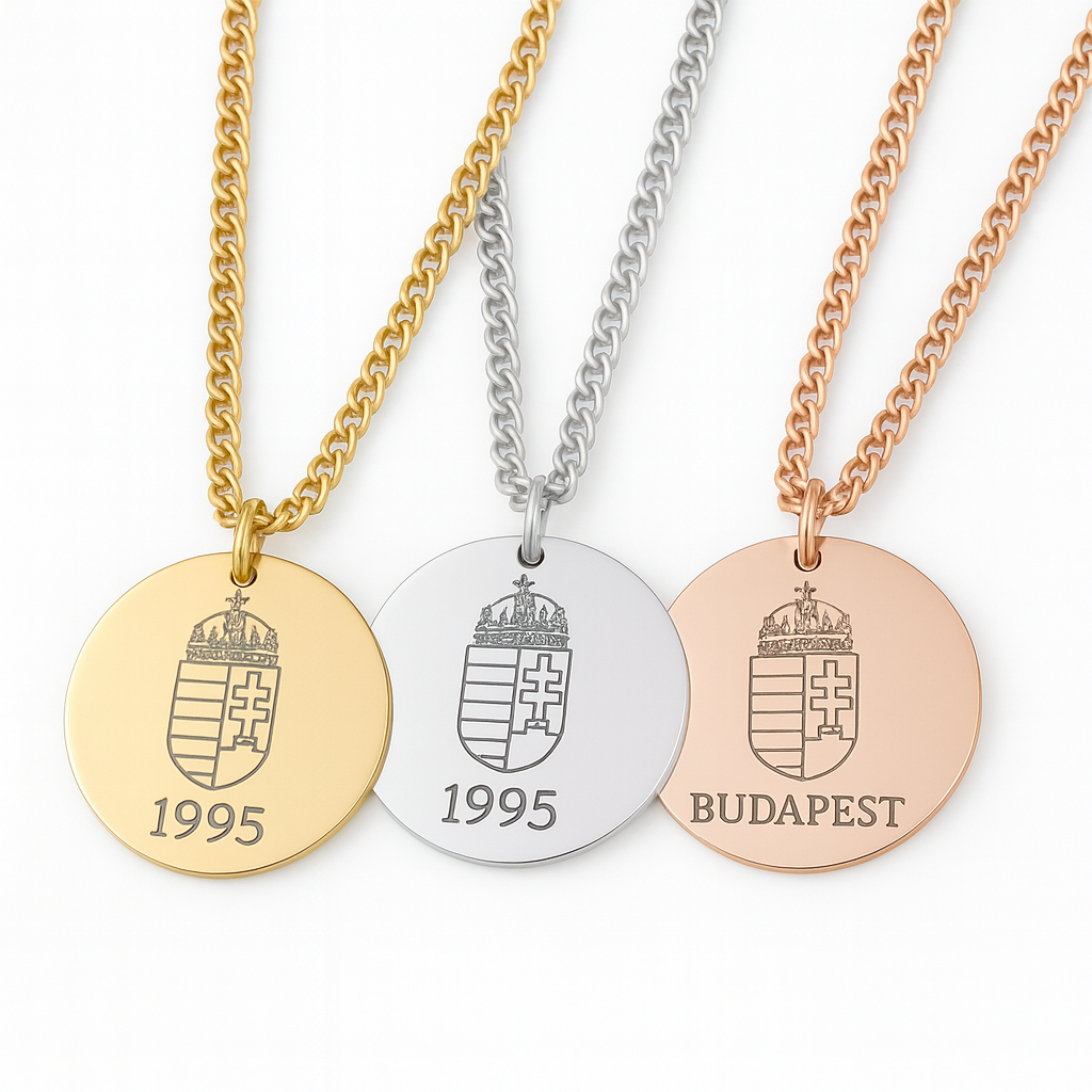 Diese hochwertige Kette mit rundem Anhänger zeigt das ungarische Wappen und wird mit deiner individuellen Gravur veredelt. Ob dein Name, dein Geburtsjahr oder deine Lieblingsstadt – du entscheidest, was unter dem Wappen stehen soll.